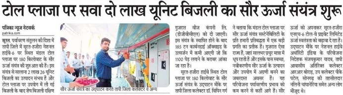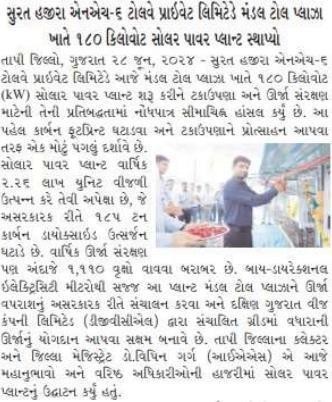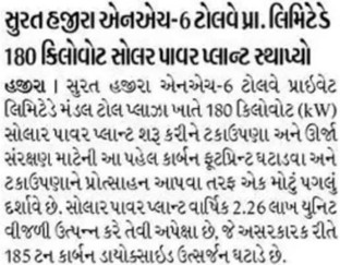 સુરત હજીરા એનએચ-6 ટોલવેપ્રા.લિમિટેડે 180 કિલોવોટ સોલર પાવર પ્લાન્ટ સ્થાપ્યો