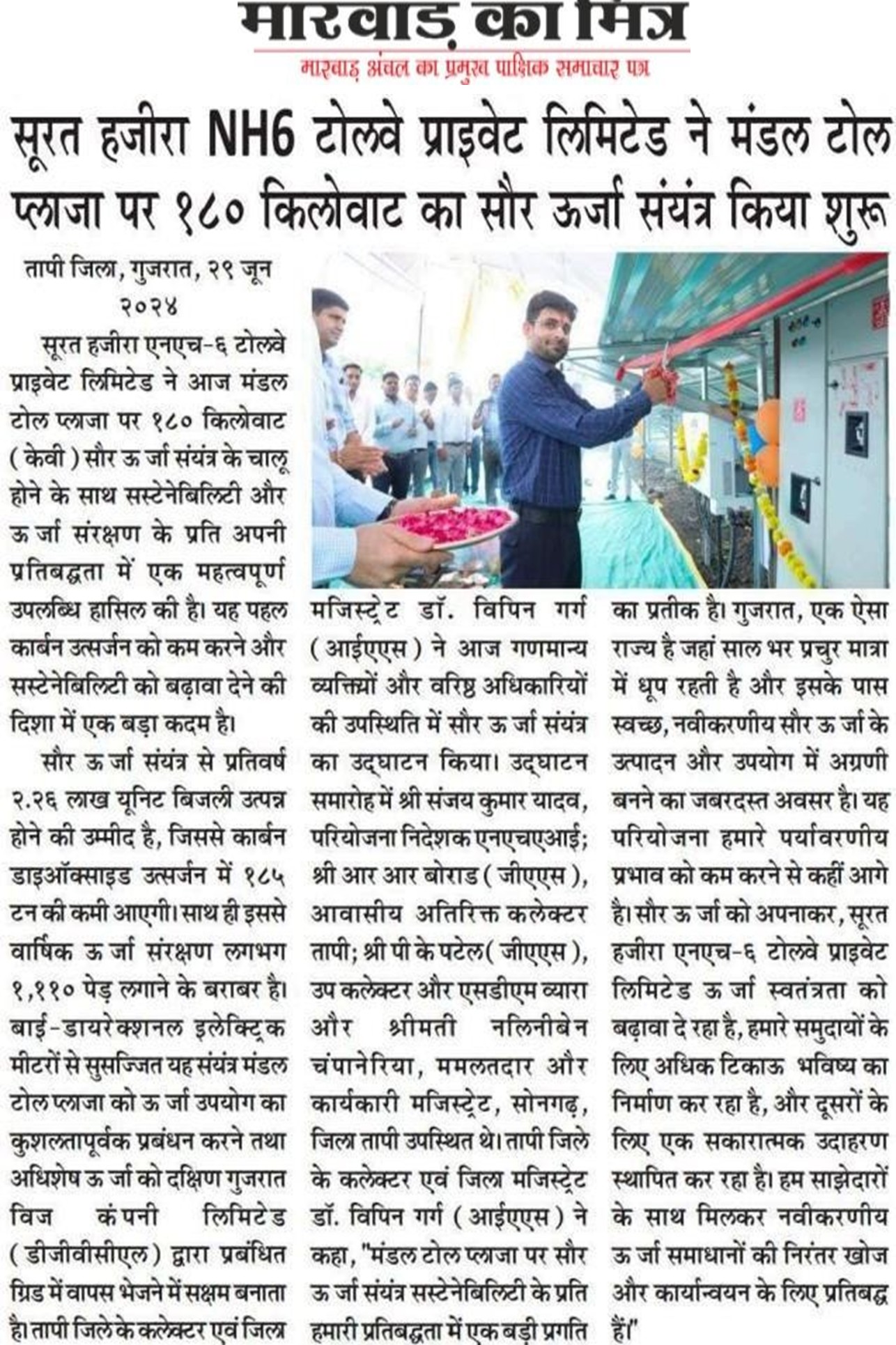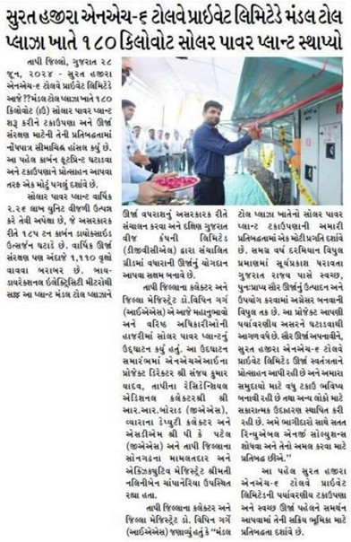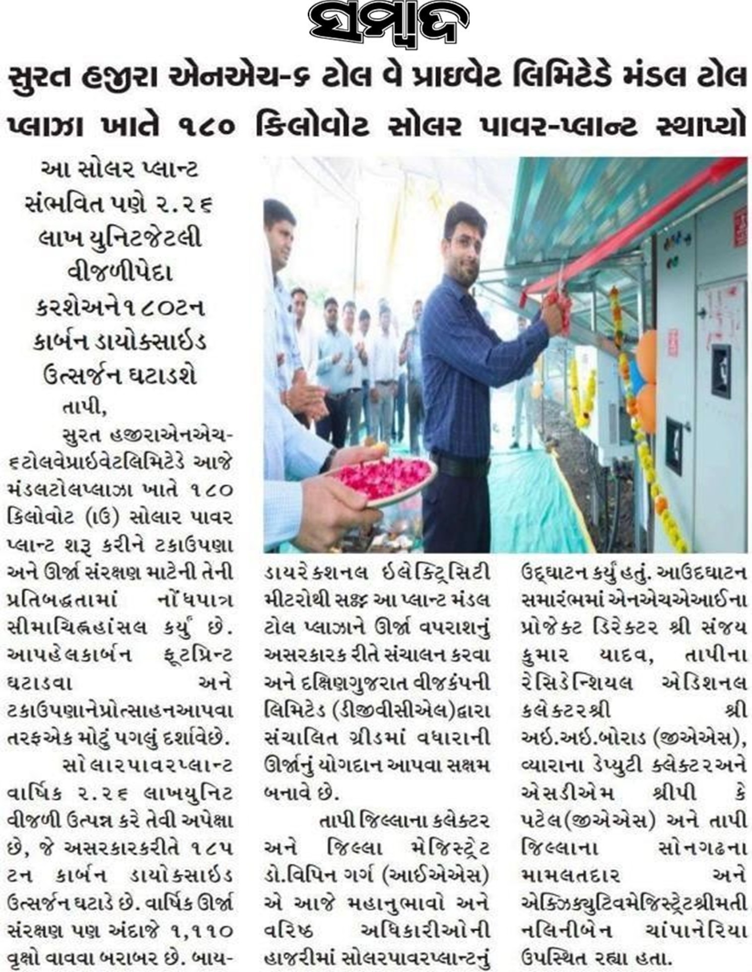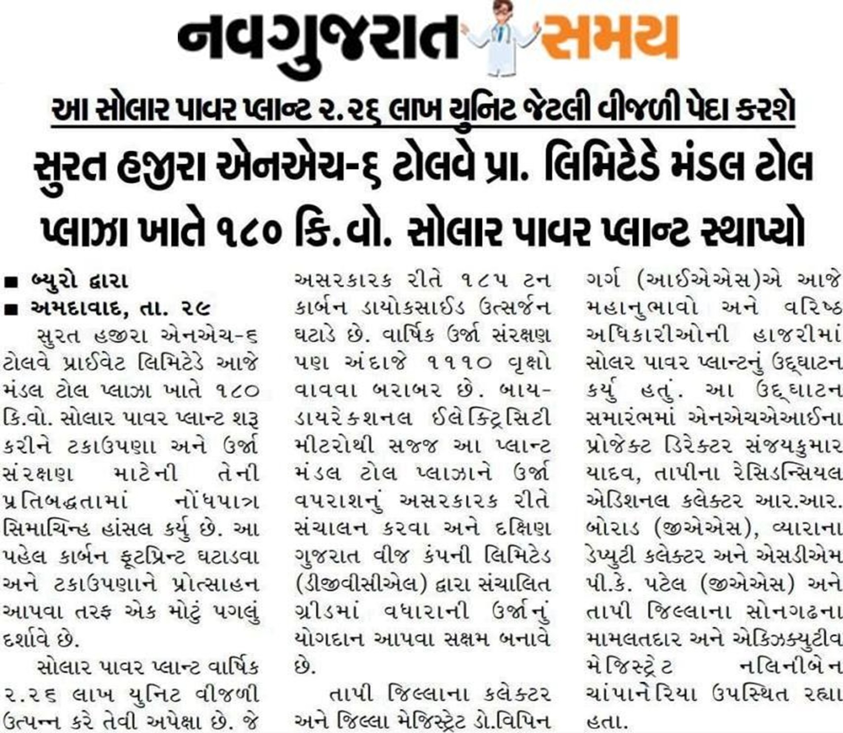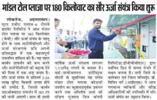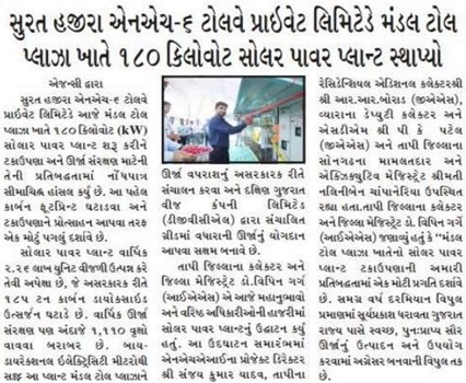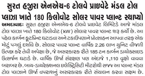 સુરત હજીરા એનએચ-૬ ટોલ વે પ્રાઇવેટ લિમિટેડે મંડલ ટોલ પ્લાઝા ખાતે ૧૮૦ કિલોવોટ સોલર પાવર-પ્લાન્ટ સ્થાપ્યો