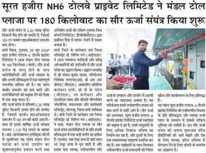 સુરત હજીરા એનએચ-૬ ટોલવે પ્રાઇવેટ લિમિટેડે માંડલ ટોલ પ્લાઝા ખાતે ૧૮૦ કિલોવોટ સોલર પાવર પ્લાન્ટ સ્થાપ્યો