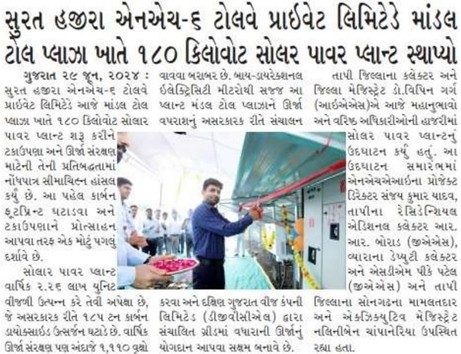 સુરત હજીરા એનએચ-૬ ટોલવે પ્રાઇવેટ લિમિટેડે મંડલ ટોલ પ્લાઝા ખાતે ૧૮૦ કિલોવોટ સોલર પાવર પ્લાન્ટ સ્થાપ્યો