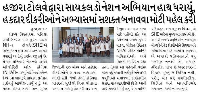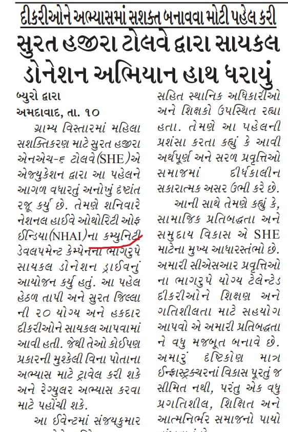 સુરત હજીરા ટોલવે દ્વારા સાયકલ ડોનેશન અભિયાન હકદાર દીકરીઓને અભ્યાસમાં સશક્ત બનાવવા પહેલ કરી