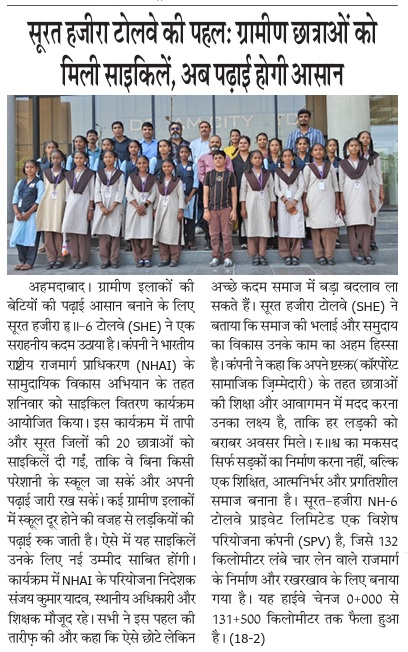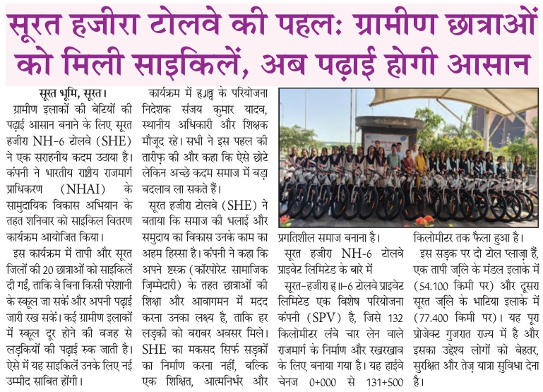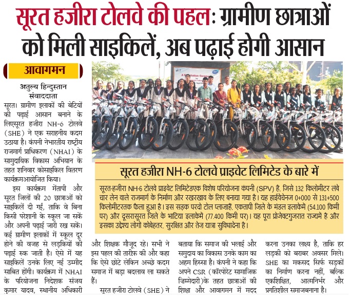 सूरत हजीरा टोलवे की पहलः ग्रामीण छात्राओं को मिली साइकिलें, अब पढ़ाई होगी आसान