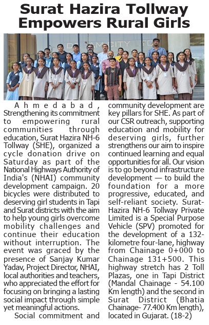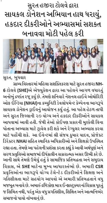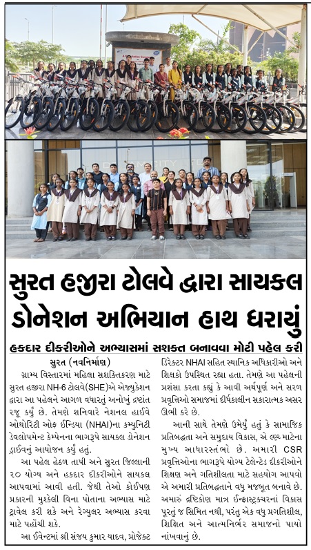 સુરત હજીરા ટોલવે દ્વારા સાયકલ ડોનેશન અભિયાન હાથ ધરાયું, હકદાર દીકરીઓને અભ્યાસમાં સશક્ત બનાવવા મોટી પહેલ કરી
